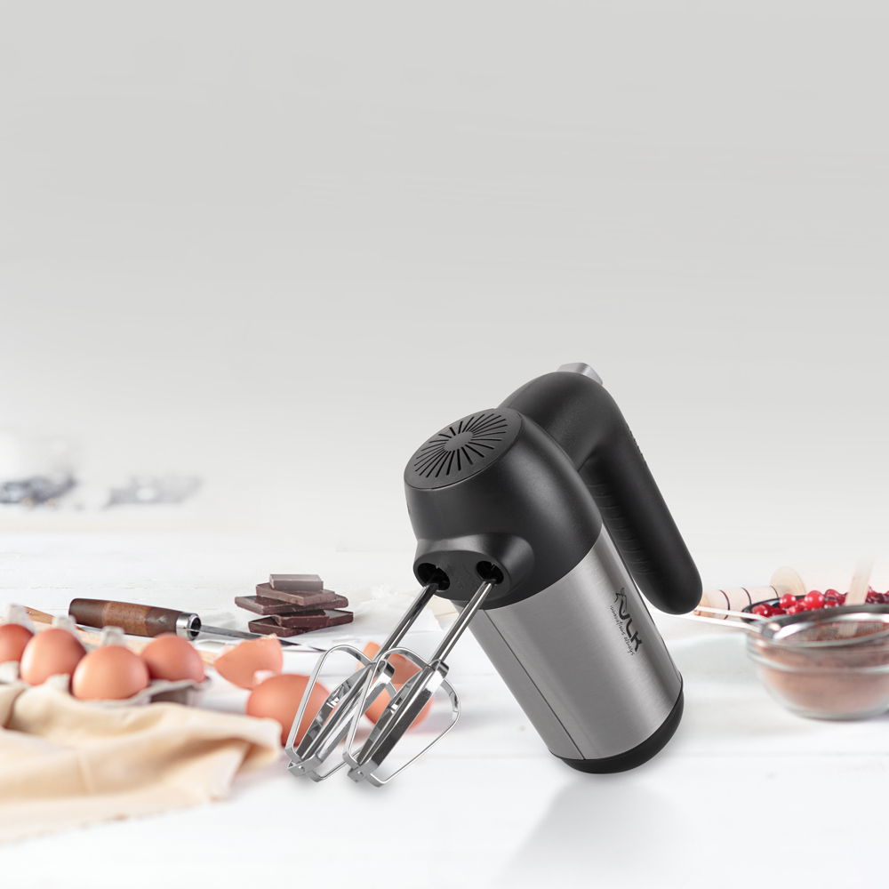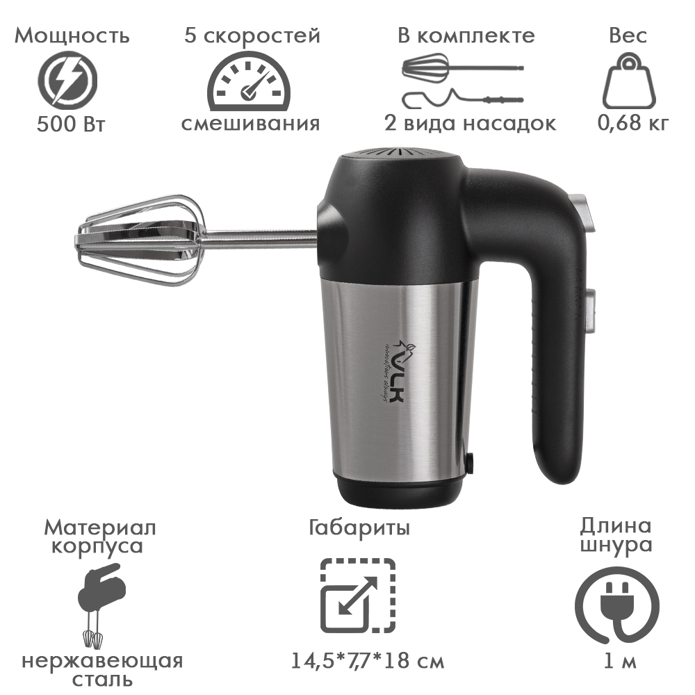 5 скоростей смешивания, Материал: нержавеющая сталь, Прочный корпус с удобной эргономичной ручкой, 2 комплекта насадок, Кнопка высвобождения насадок