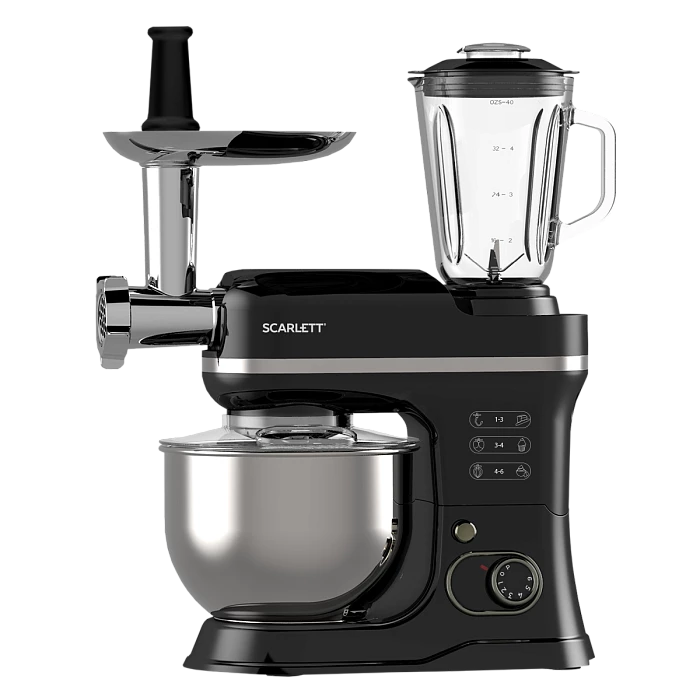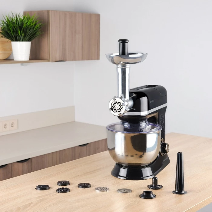 Насадки: Венчик для взбивания, крюк для замешивания теста, лопатка для смешивания, насадки для приготовления кеббе и домашних колбасок, 4 насадки для приготовления домашней пасты (перья, лингвини, спагетти 2 мм, спагетти 3 мм), 3 перфорированных диска для фарша
