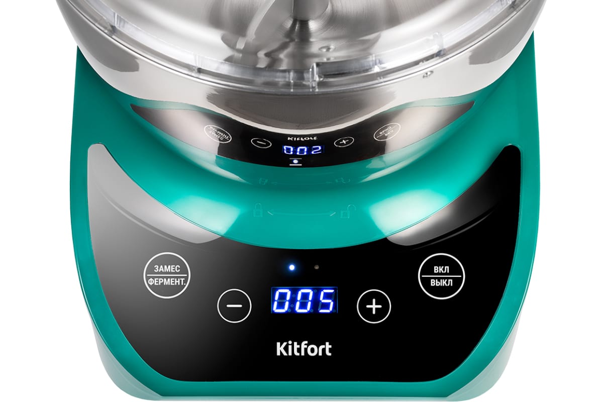 Управление прибором осуществляется с помощью сенсорных кнопок на панели управления. Также есть дисплей, на котором отображается время работы прибора. Тестомесильная машина может работать в автоматическом режиме. Вам достаточно только положить ингредиенты, надеть насадку и установить время замеса: от 5 до 15 минут с шагом 2 минуты. После того как прибор замесит тесто, его можно оставить на расстойку прямо в чаше и выбрать время от 10 минут до 1 часа 45 минут с шагом 10 минут. Чаша будет нагреваться, температура нагрева чаши варьируется от 30 до 40 °С. Во время расстойки тесто поднимается и увеличивается в объеме. По окончании времени прибор подаст звуковой сигнал и автоматически прекратит работу.