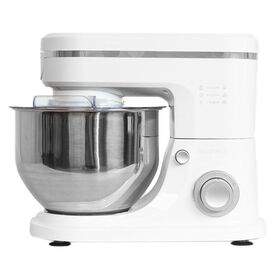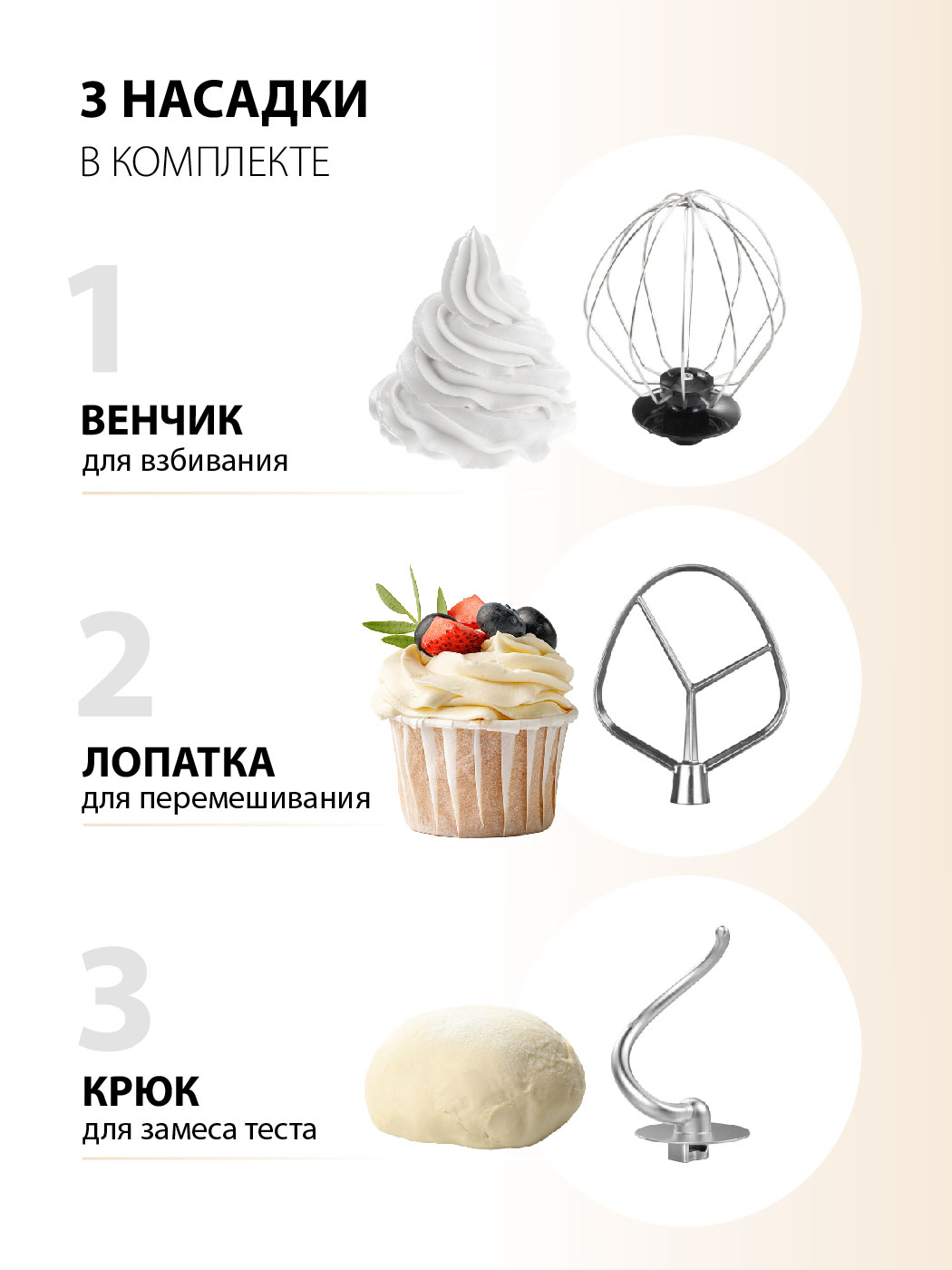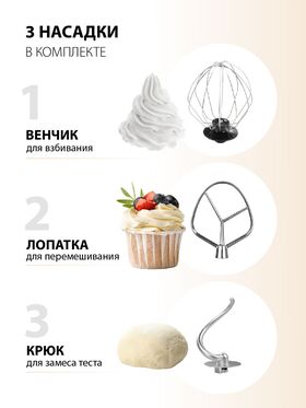 Комплектация миксер, чаша из нержавеющей стали, крышка чаши, крючок для замеса теста, лопатка для перемешивания, венчик для взбивания, инструкция на русском языке, гарантийный талон