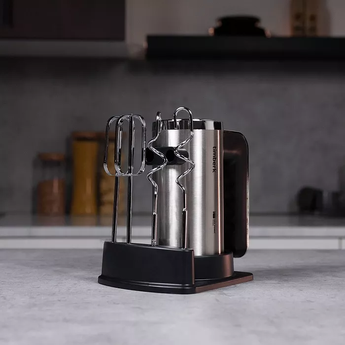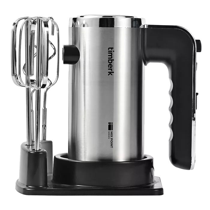 В комплекте предусмотрены 2 крюка для замешивания теста и 2 венчика для взбивания яиц и крема, смешивания жидкостей. Значимым преимуществом модели является увеличенная длина насадок длиной 18 см, способствующая переработке продуктов даже в глубокой посуде. Для компактного хранения насадок в комплекте предусмотрена специальная подставка.