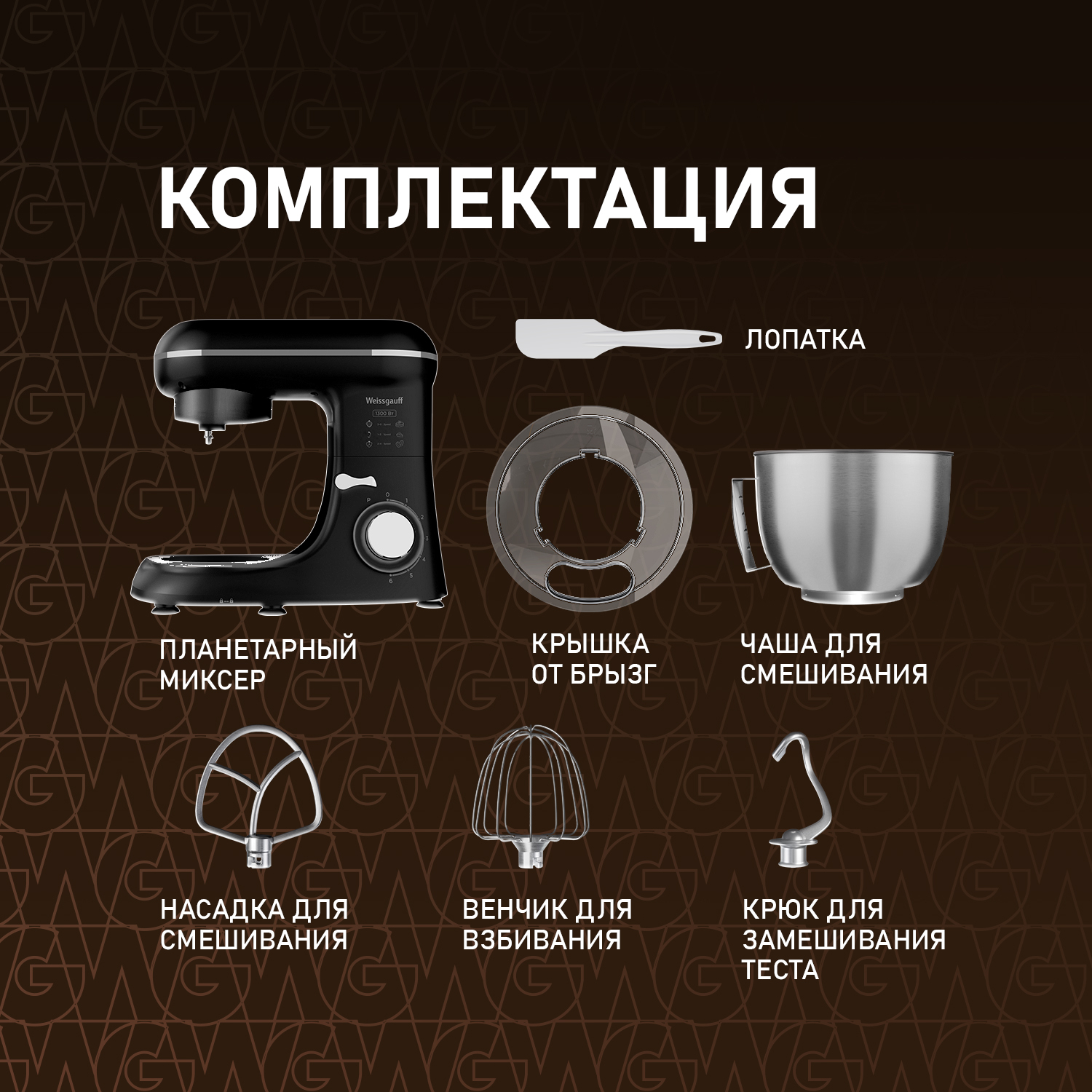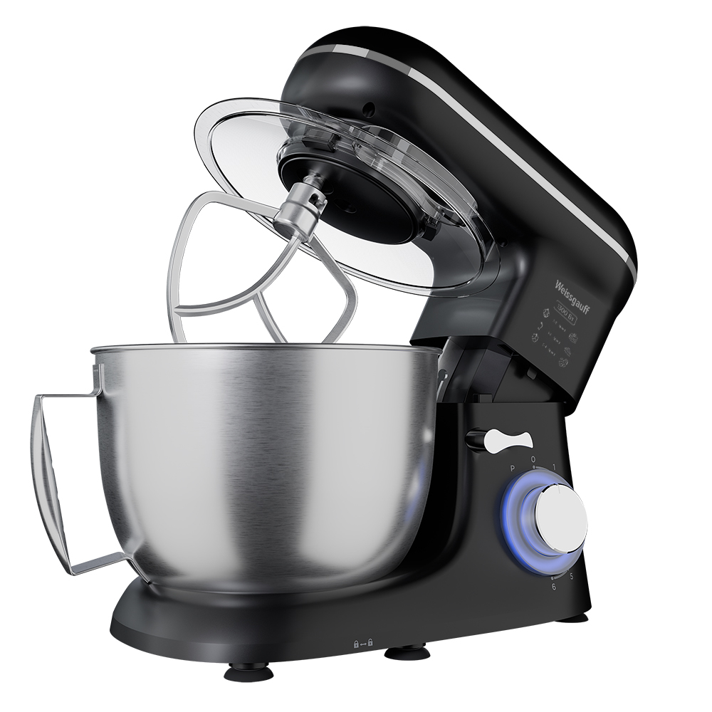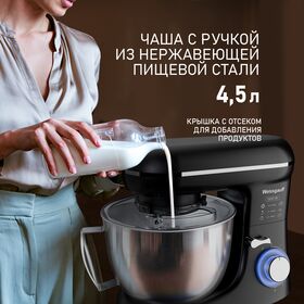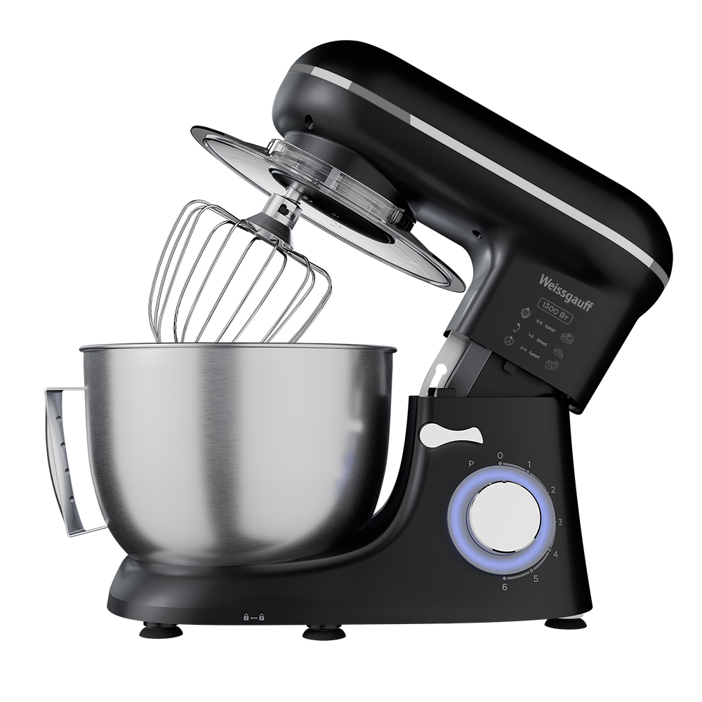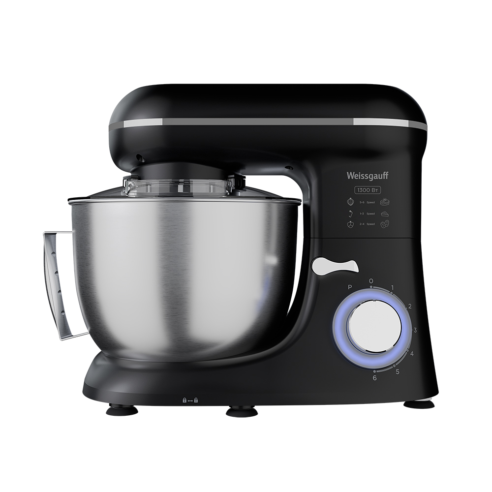 Электрический планетарный миксер от Weissgauff, обладающий впечатляющей мощностью 1300 Вт, оснащенный набором цельнометаллических насадок для теста и для смешивания, венчиком для взбивания, а также удобной чашей с крышкой - это незаменимый помощник на вашей кухне, который поможет вам воплотить в реальность самые смелые кулинарные идеи!