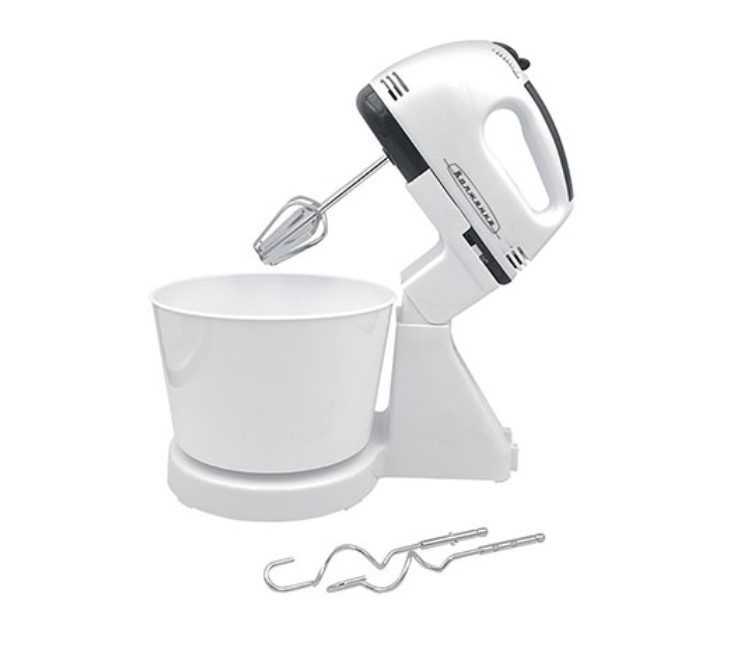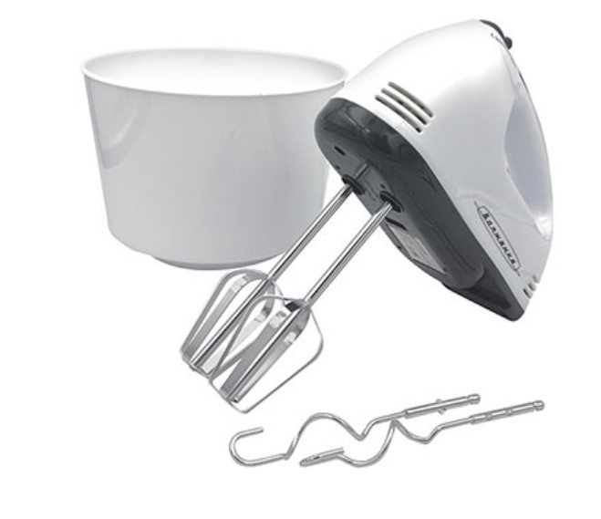 В наборе два комплекта насадок – венички для взбивания яиц и крема, крючки для замешивания тяжелого теста.