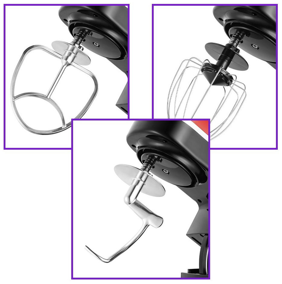 Венчик для взбивания служит для взбивания яичных белков, замешивания жидкого теста. Крюк для замешивания подходит для замешивания густого теста. Насадка для смешивания используется для негустых ингредиентов, приготовления картофельного пюре и т.д.