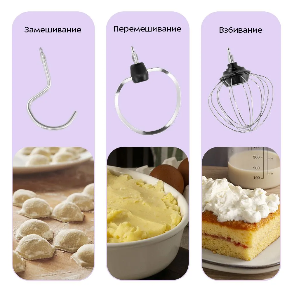 В комплект входят венчик для взбивания, крюк для замешивания крутого теста и насадка для смешивания и приготовления пюре. Благодаря тщательно продуманной форме насадок и чаши, можно качественно перемешать практически любое количество продуктов.