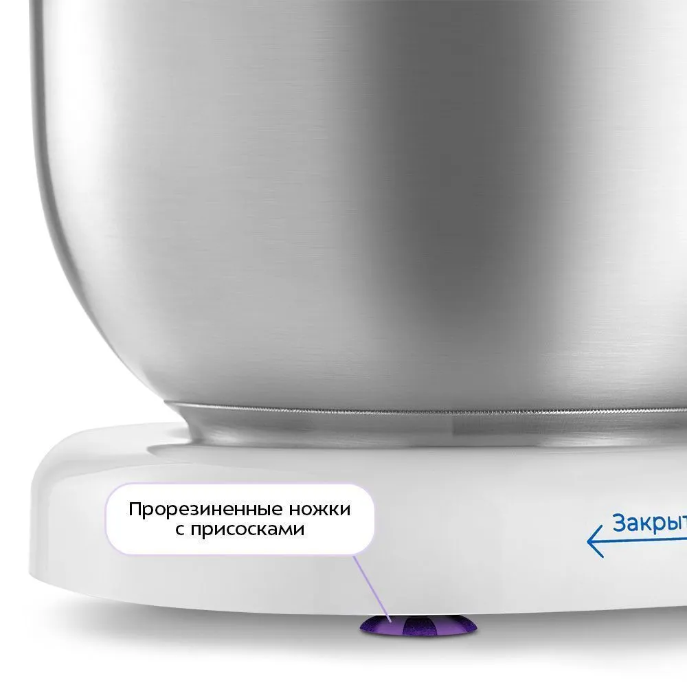 Миксер оснащён чашей ёмкостью 3 литра. Чаша изготовлена из нержавеющей стали, она прочная, и в ней можно смешивать даже горячие ингредиенты. В неё можно добавлять ингредиенты во время работы, не выключая миксер и не поднимая моторный блок.