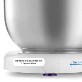 ланетарный миксер КТ-4428 автоматически выключается при откидывании моторного блока. Прорезиненные ножки с присосками прочно фиксируют миксер на столе. Все комплектующие легко снимаются и очищаются.