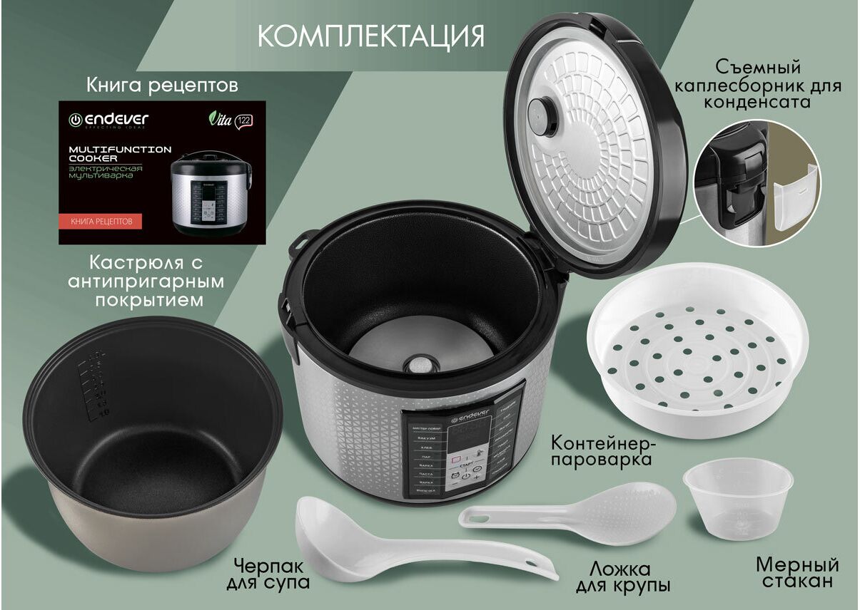 Мультиварка, Съемная чаша, Контейнер-пароварка, Ложка, Черпак для супа, Мерный стакан, Шнур питания, Руководство по эксплуатации, Гарантийный талон, Книга рецептов