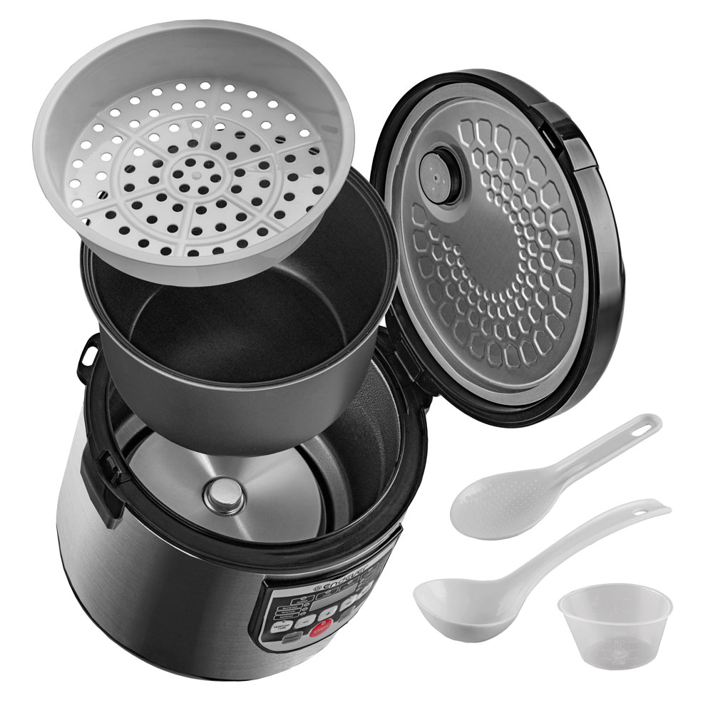 Мультиварка, Съемный каплесборник для конденсата, Съемная кастрюля, Контейнер-пароварка, Черпак для супа, Ложка для крупы, Мерный стакан, Держатель для ложки, Клапан выпуска пара, Шнур питания, Руководство по эксплуатации, Книга рецептов