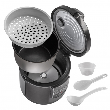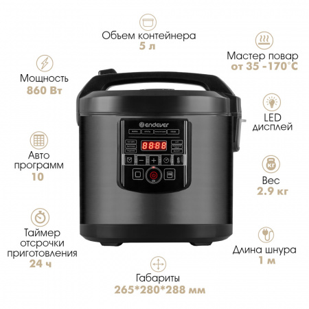 10 автоматических программ, Электронное управление, Функция «Мультиповар» (35–170°С), Автоподогрев до 12 часов, Таймер отсрочки приготовления до 24 часов, LED-дисплей, Ручная регулировка времени приготовления, Автоподогрев после окончания программы, Съемная чаша с высококачественным антипригарным покрытием, Металлический корпус