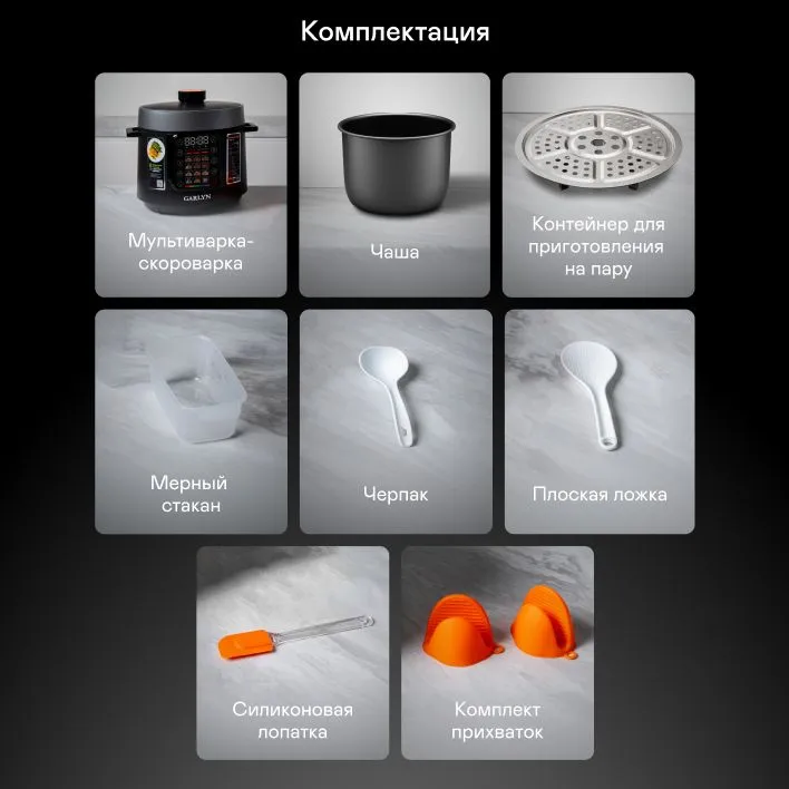 Программы приготовления: Варка, Выпечка, Детское питание, Жарка, Каша, Крупа, Отложенный старт, Мультиповар, Подогрев, Приготовление на пару, Суп, Томление, Тушение
