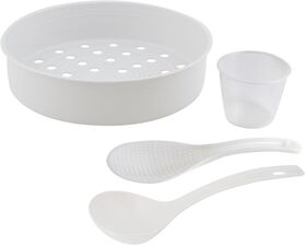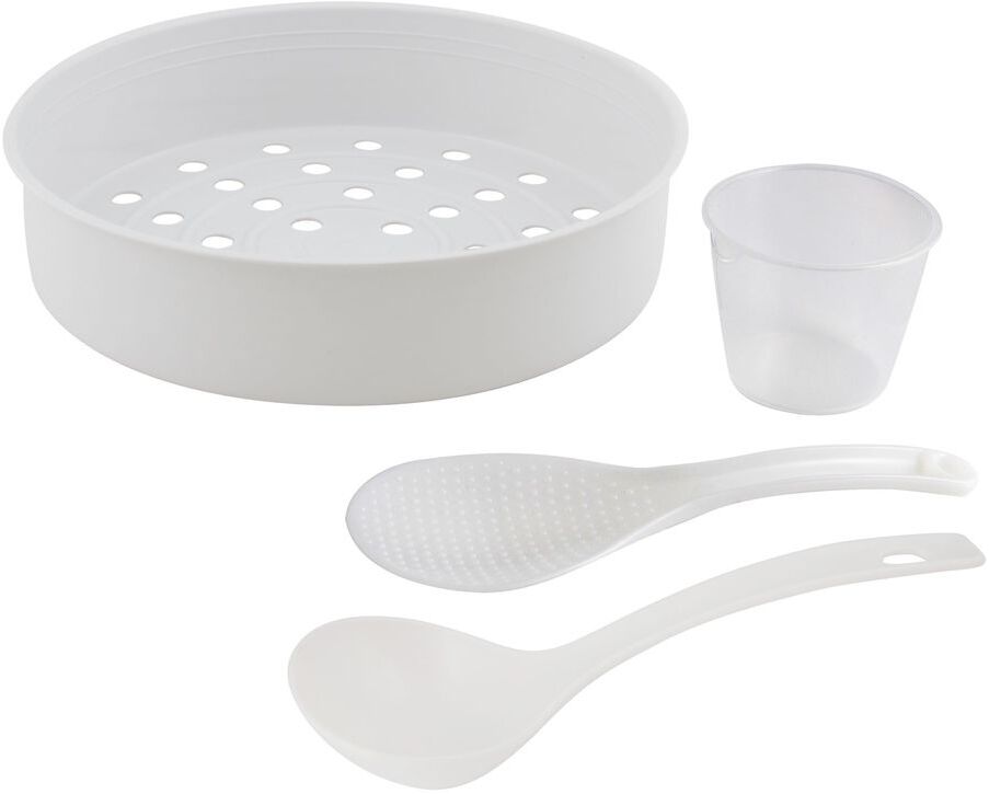 Модель оснащена таймером отсрочки 24 часа, что позволяет приготовить еду к назначенному времени. С мультиваркой идет стандартный набор аксессуаров: плоская ложка, столовая ложка, мерная чашка, контейнер для варки на пару.