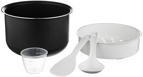 мультиварка, чаша, шнур электропитания, контейнер для приготовления на пару, мерный стакан, плоская ложка, черпак, руководство по эксплуатации, сервисная книжка, книга на 120 рецептов