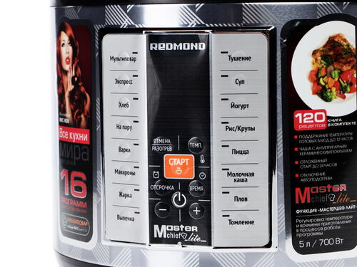 Режимы приготовления рис/крупы, варка, выпечка, жарка, йогурт, макароны, молочная каша, мультиповар, на пару, пицца, плов, суп, томление, тушение, хлеб, экспресс