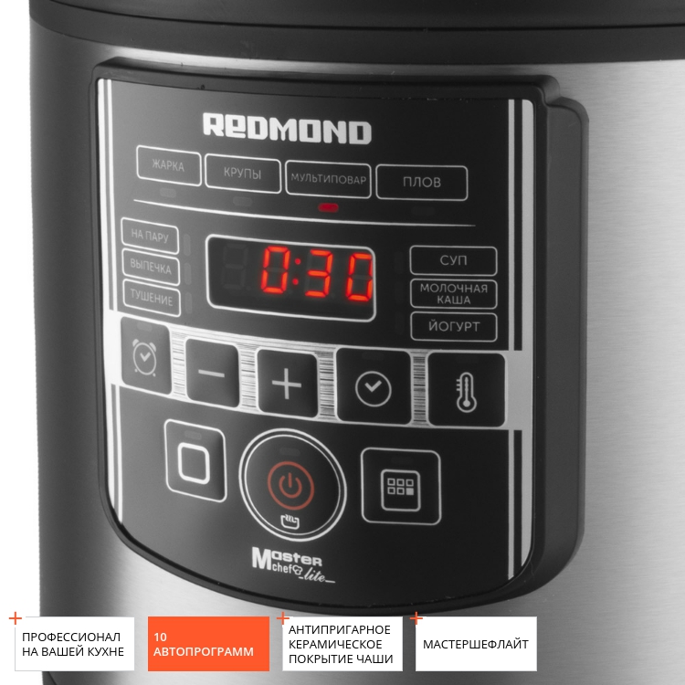 Программы приготовления: На пару; Жарка; Йогурт; Мультиповар; Тушение; Молочная каша; Плов; Крупы; Суп; Выпечка