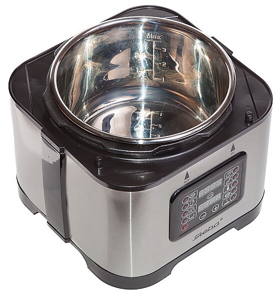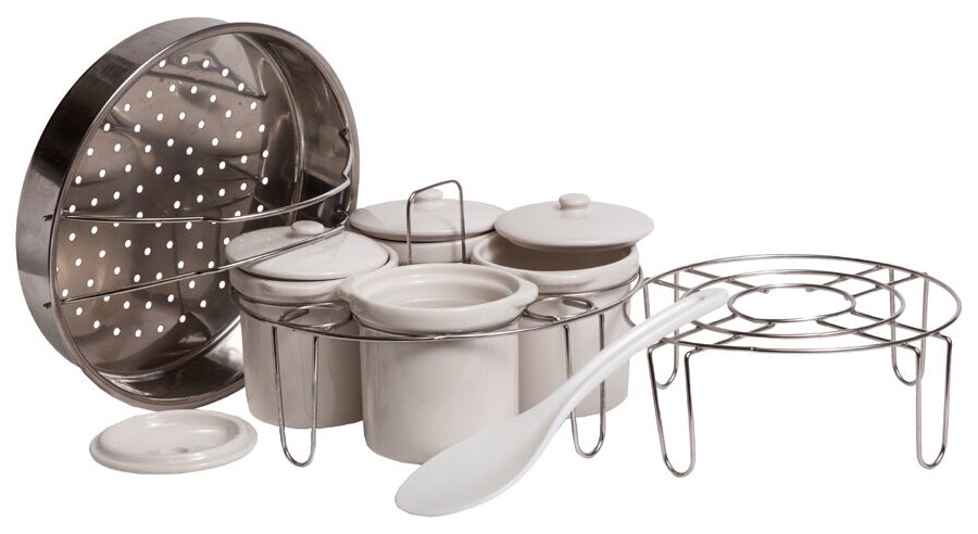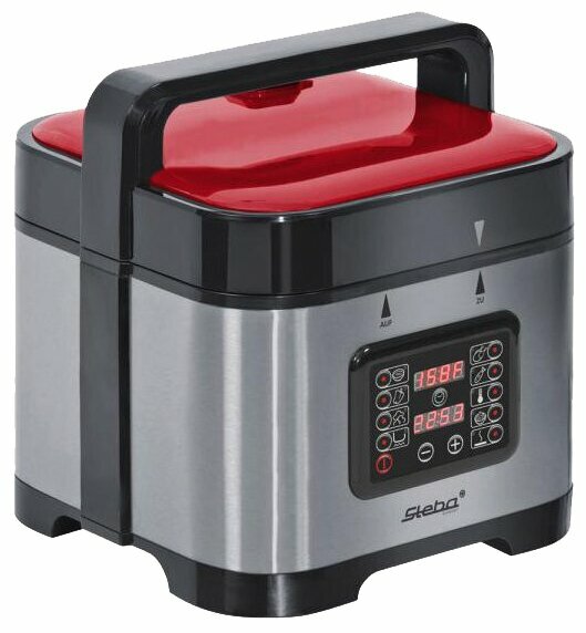 мультиварка Steba DD2, чаша из нержавеющей стали с двойным дном объёмом 5 л, крышка для стальной чаши, корзина для готовки на пару, держатель для паровой корзины, керамические стаканчики – 4 шт по 230 мл (для йогурта или запекания), держатель для керамических стаканчиков, запасное уплотнительное кольцо для крышки, мерный стакан, лопаточка для перемешивания, книга рецептов, руководство по эксплуатации