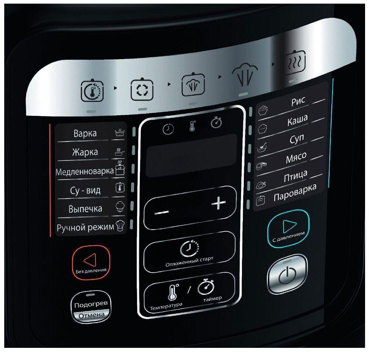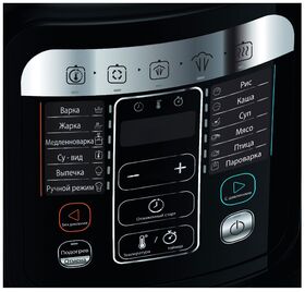 варка, выпечка, жарка, запекание, йогурт, крупа, молочная каша, мультиповар, мясо, приготовление на пару, суп, тушение, Отложенный старт, быстрый рис, говядина/баранина, загустение соуса, курица/утка, отложенный старт, подогрев, регулировка температуры, соте/обжарка, су-вид