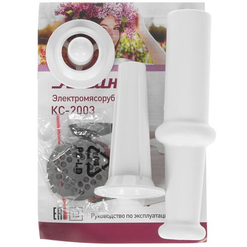 Комплектация толкатель, загрузочный лоток, 2 перфорированных диска для фарша на 5 мм и 7 мм