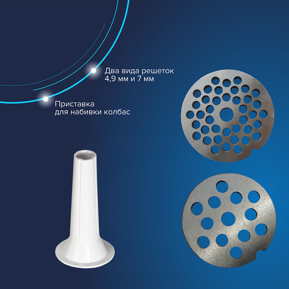Дополнительные насадки: решетка с отверстиями 5 мм, решетка с отверстиями 7 мм, решетка с овальными отверстиями, приставка соковыжималка.