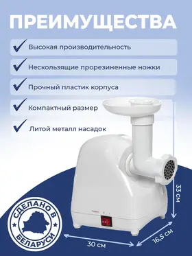 Мощная электрическая мясорубка Белвар КЭМ-П2У 302-07 станет надежной помощницей на Вашей кухне. Она идеально впишется как в квартире так и на даче имеет стильный и эргономичный дизайн. Данная модель имеет надежный мотор 220 Вт, максимальная мощность при блокировке вала 1500 Вт. Благодаря данным показателям мясорубка выдает производительность 24 кг/час. С помощью данной модели Вы сможете приготовить фарш из сырого и отварного мяса. Модель функциональна имеет насадку для домашней колбасы, что позволит Вам удивить гостей на любом празднике дома или барбекю на природе. Модель оснащена функцией "Реверс". Электромясорубка- помощница на вашей кухне, призвана облегчить ручной труд хозяйки. Мясорубка выполнена в стильном компактном корпусе из ABS пластика с легкостью справится с поставленной задачей и станет незаменимой помощницей при приготовлении множества блюд. Имеющаяся в комплекте насадка для профилирования теста, поможет Вам приготовить украшения для пирога или вкусное печенье для Ваших детей. Удобства использования отсек для шнура а также прорезиненные ножки пользоваться мясорубкой одно удовольствие. Данная модель предоставит вам возможность экономить время и готовить любимые блюда быстро и с удовольствием. Две сменные решетки (крупная и мелкая) помогут удовлетворить запросы любого дегустатора, как взрослого так и ребенка.