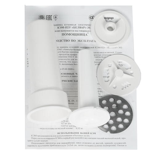 Комплектация инструкция, 2 решетки для фарша, насадка для профилирования теста, насадка для колбас
