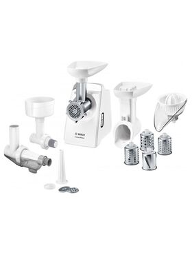 Комплектация барабан; мясорубка; перфорированный диск для фарша - 3 шт.; цитрус-пресс; насадка для колбас; насадка для кеббе; барабан для крупной терки; барабан для мелкой терки; барабан для тонких ломтиков