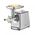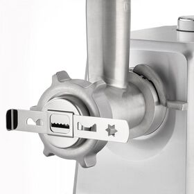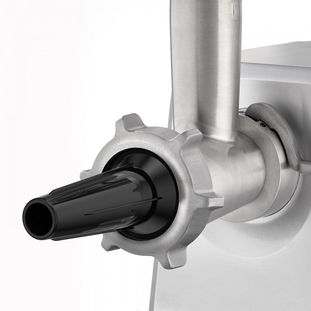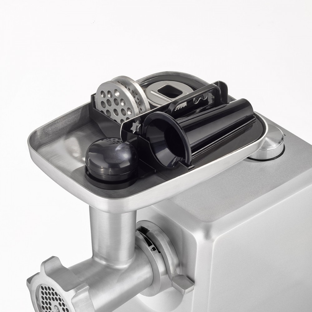 В комплект мясорубки входит пресс для котлет для гамбургеров двух размеров и котлет с начинкой. Также комплект включает в себя три перфорированных диска из нержавеющей стали (3 мм, 5 мм и 8 мм), насадку для колбас, насадку для выпечки с четырьмя формами. Благодаря легкой сборке и разборке всех деталей чистка невероятно проста. После использования аксессуары можно хранить в большом алюминиевом поддоне для экономии места.