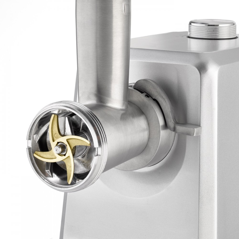 Двигатель максимальной мощностью 2500 Вт способен быстро переработать до 2,5 кг продуктов и без особых усилий измельчить сырое и приготовленное мясо, рыбу, овощи и многое другое. Помимо удобной работы с двумя уровнями скорости, FW 2500 впечатляет высококачественными и прочными лезвиями с титановой отделкой и практичной функцией возврата, которая мягко удаляет остатки. В комплект входит большой алюминиевый поддон, а также поддон для капель 2-в-1, который также служит крышкой для алюминиевого поддона.