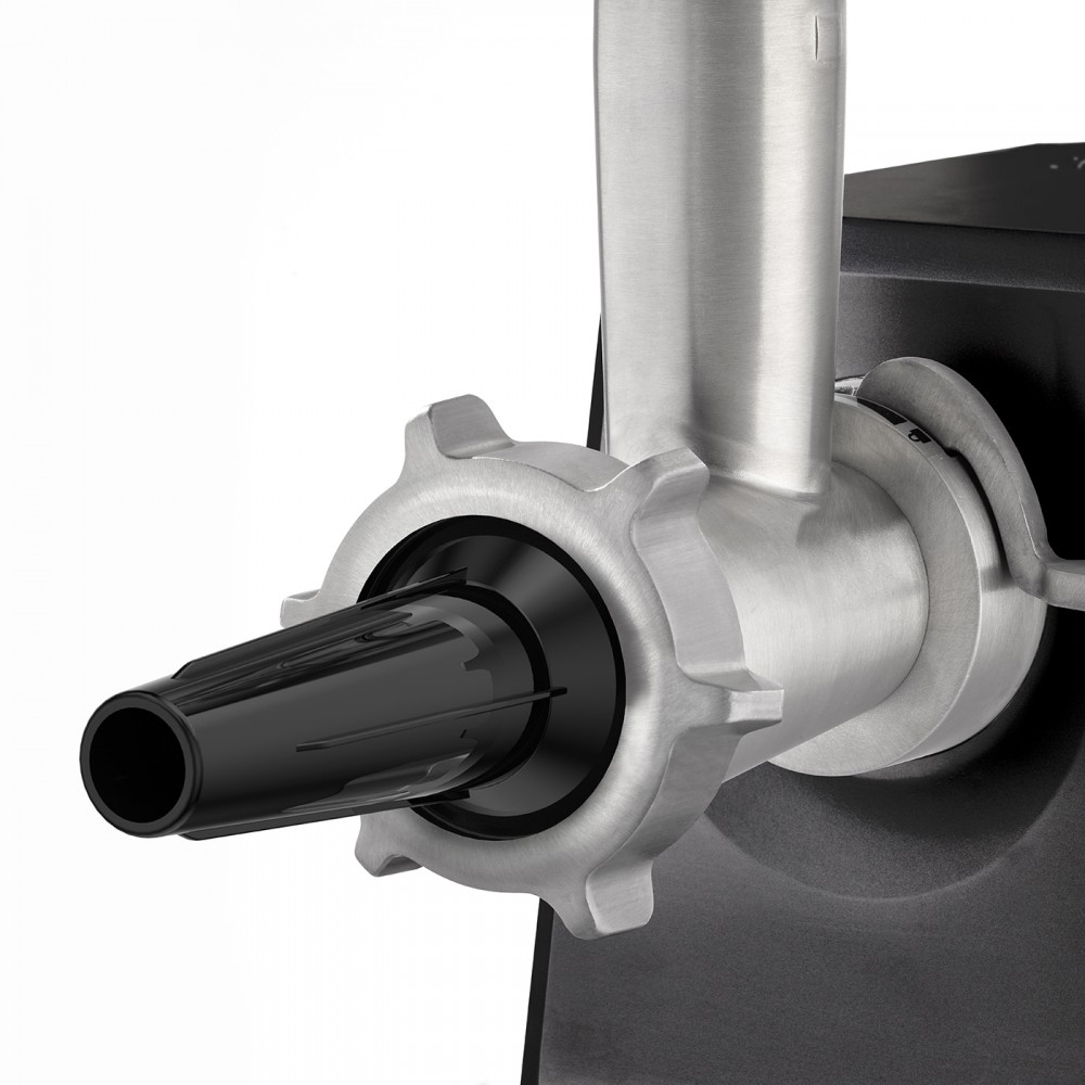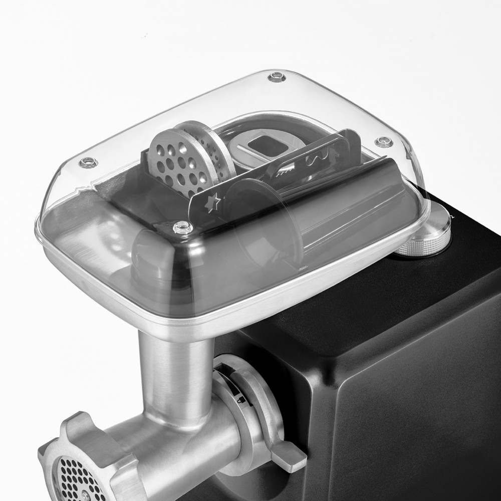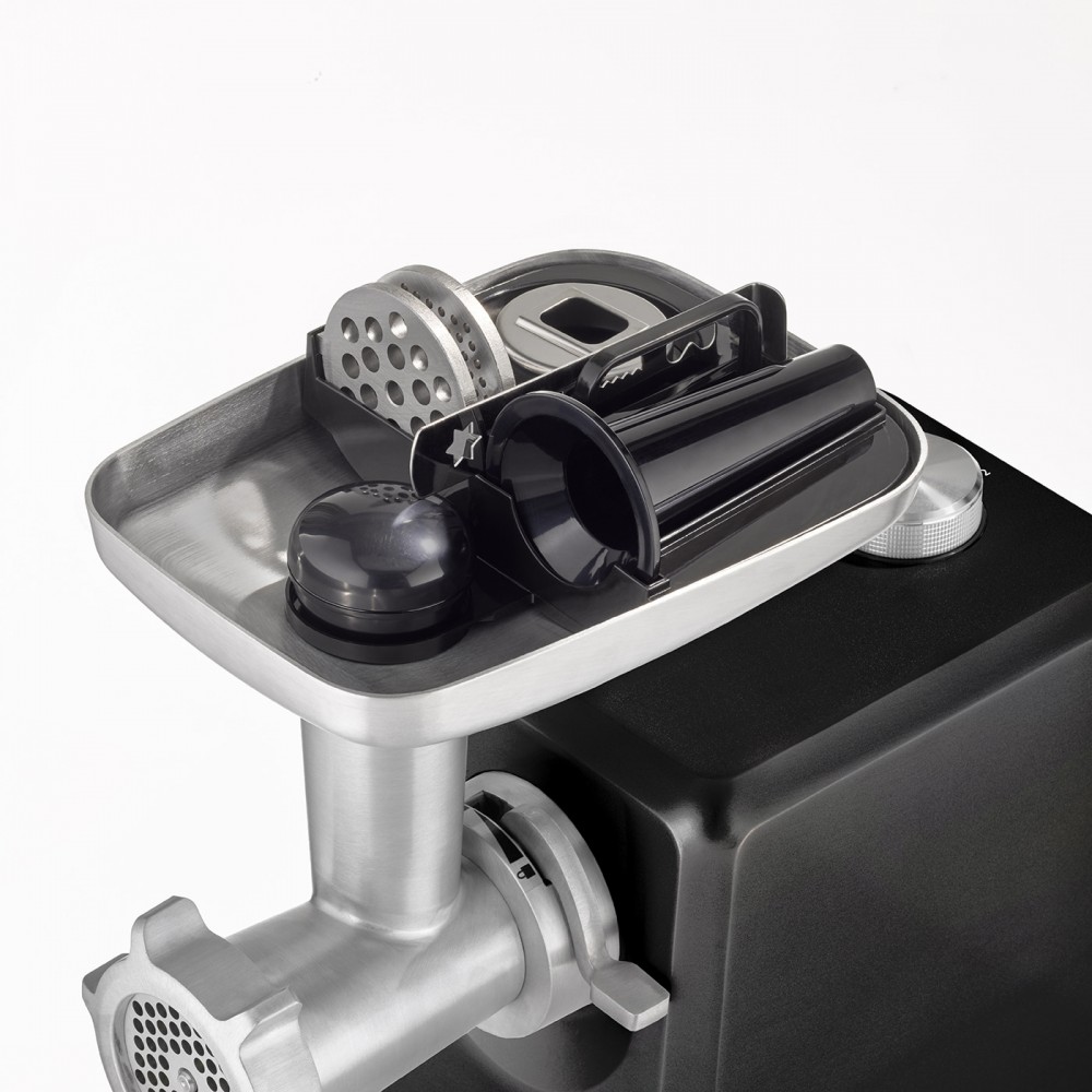 В комплект мясорубки входит пресс для котлет для гамбургеров двух размеров и котлет с начинкой. Также комплект включает в себя три перфорированных диска из нержавеющей стали (3 мм, 5 мм и 8 мм), насадку для колбас, насадку для выпечки с четырьмя формами. Благодаря легкой сборке и разборке всех деталей чистка невероятно проста. После использования аксессуары можно хранить в большом алюминиевом поддоне для экономии места.