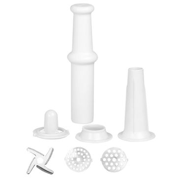 Комплектация насадка для колбасы и кеббе, измельчающий нож, 2 перфорированных диска для фарша, толкатель, загрузочный лоток