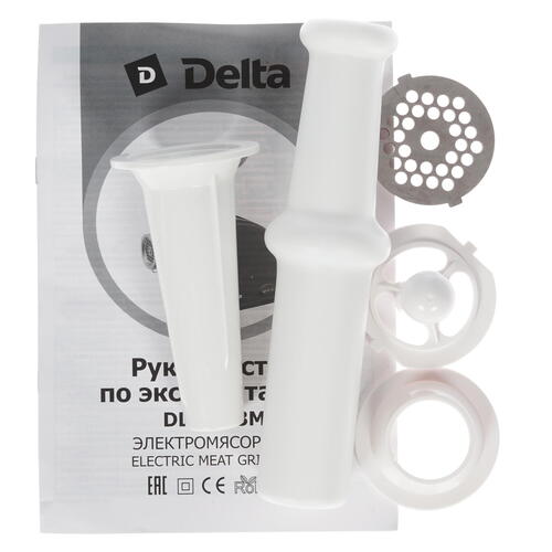Комплектация насадка для кеббе, насадка для колбас, документация, толкатель, загрузочный лоток, 2 перфорированные решетки с отверстиями 5 и 7 мм