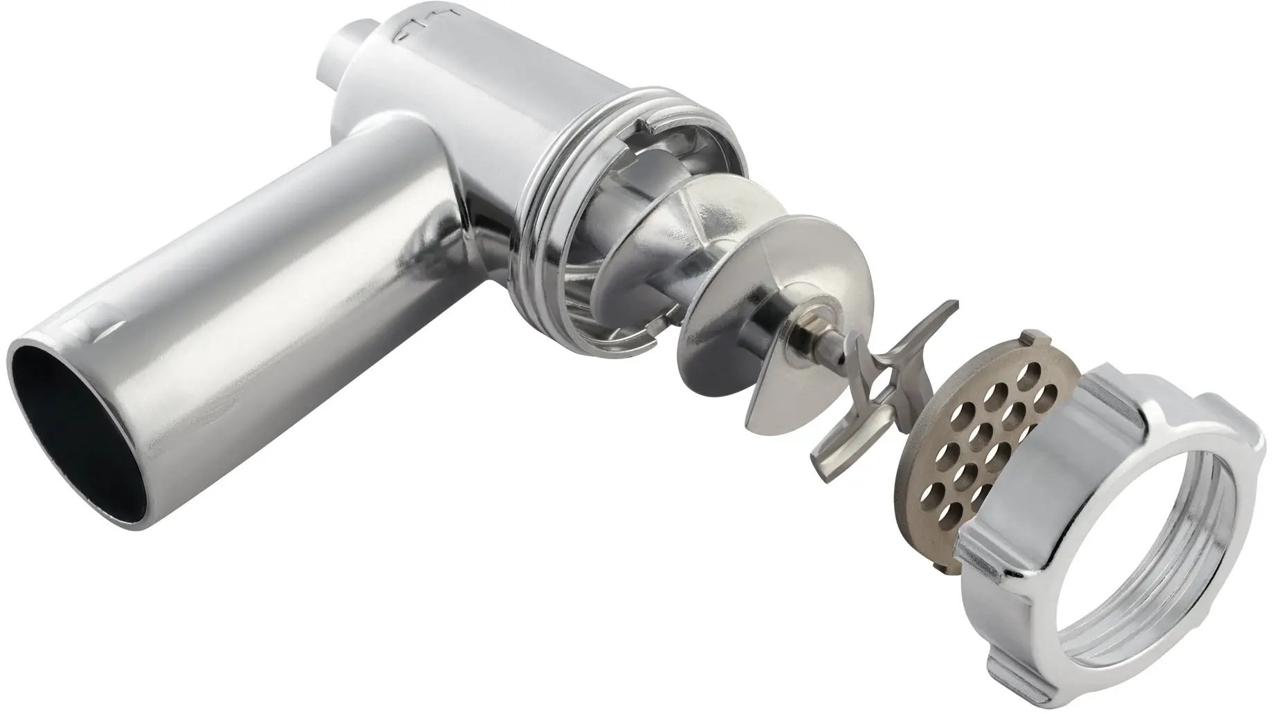 Нож из нержавеющей стали. Материал основных рабочих частей мясорубки устойчив к механическим нагрузкам и воздействию коррозии, что способствует продолжительному сроку её службы.