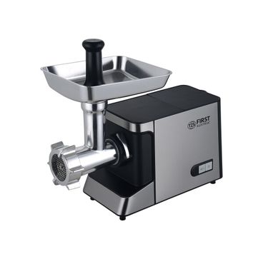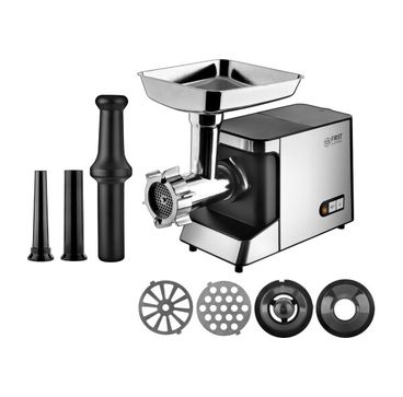 2 перфорированных диска для фарша на 4 мм и 8 мм, 2 насадки для колбасы, насадка для кеббе, документация, толкатель, загрузочный лоток, перфорированный диск с треугольными отверстиями