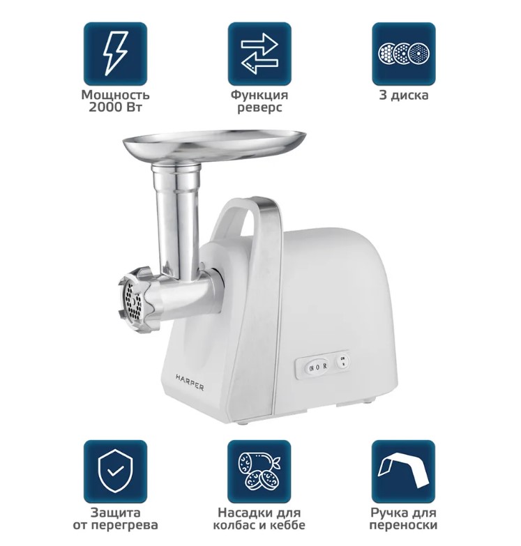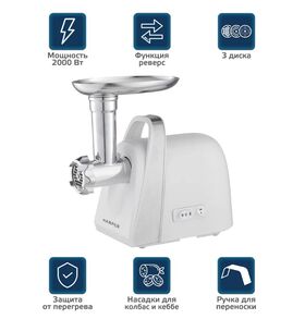 Легкая, практичная и очень удобная электрическая мясорубка Harper HMG-2011 обеспечивает переработку сырья со скоростью до 1,8 кг в минуту. В комплект поставки входят три варианта сменных дисков с разным диаметром отверстий (для формирования фарша разной консистенции) и две дополнительные насадки: для приготовления кеббе и сосисок (колбас). Все части мясорубки изготовлены из металла, поэтому практичны в обиходе: легко моются вручную или с помощью моечных машин, устойчивы к механическим повреждениям. Есть функция реверса и удобная ручка для переноски и/или правильного позиционирования на столе.