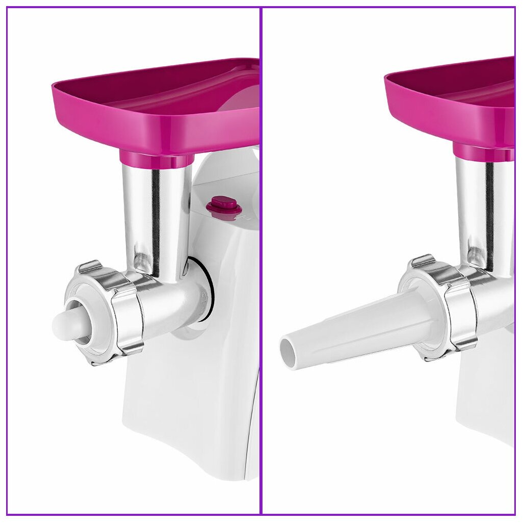 Комплектация 1. Моторный блок — 1 шт. 2. Загрузочный блок — 1 шт. 3. Загрузочный лоток — 1 шт. 4. Толкатель — 1 шт. 5. Шнек — 1 шт. 6. Насадка для кеббе — 1 шт. 7. Крышка насадки для кеббе — 1 шт. 8. Насадка для колбас — 1 шт. 9. Нож — 1 шт. 10. Кольцевая гайка — 1 шт. 11. Решетка с отверстиями 5 мм — 1 шт. 12. Решетка с отверстиями 7 мм — 1 шт. 13. Руководство по эксплуатации — 1 шт. 14. Коллекционный магнит — 1 шт.* *опционально