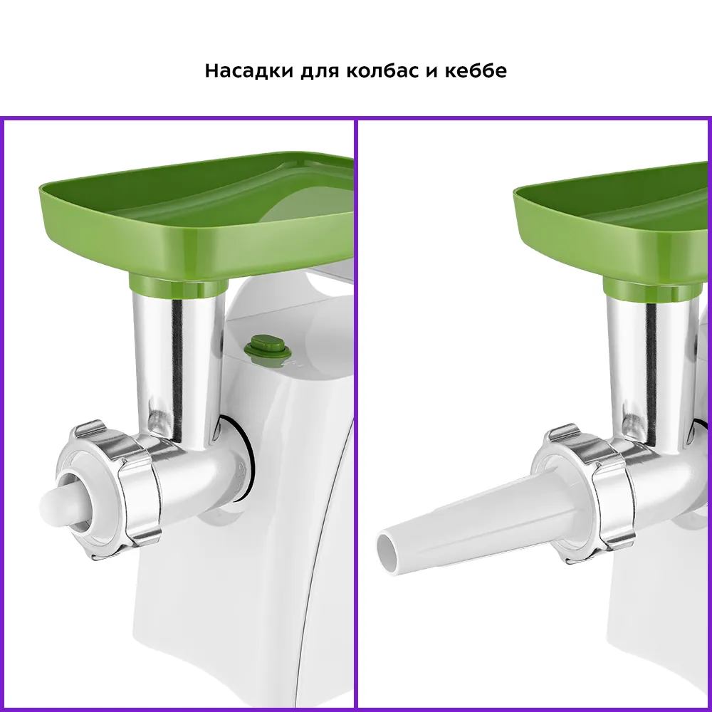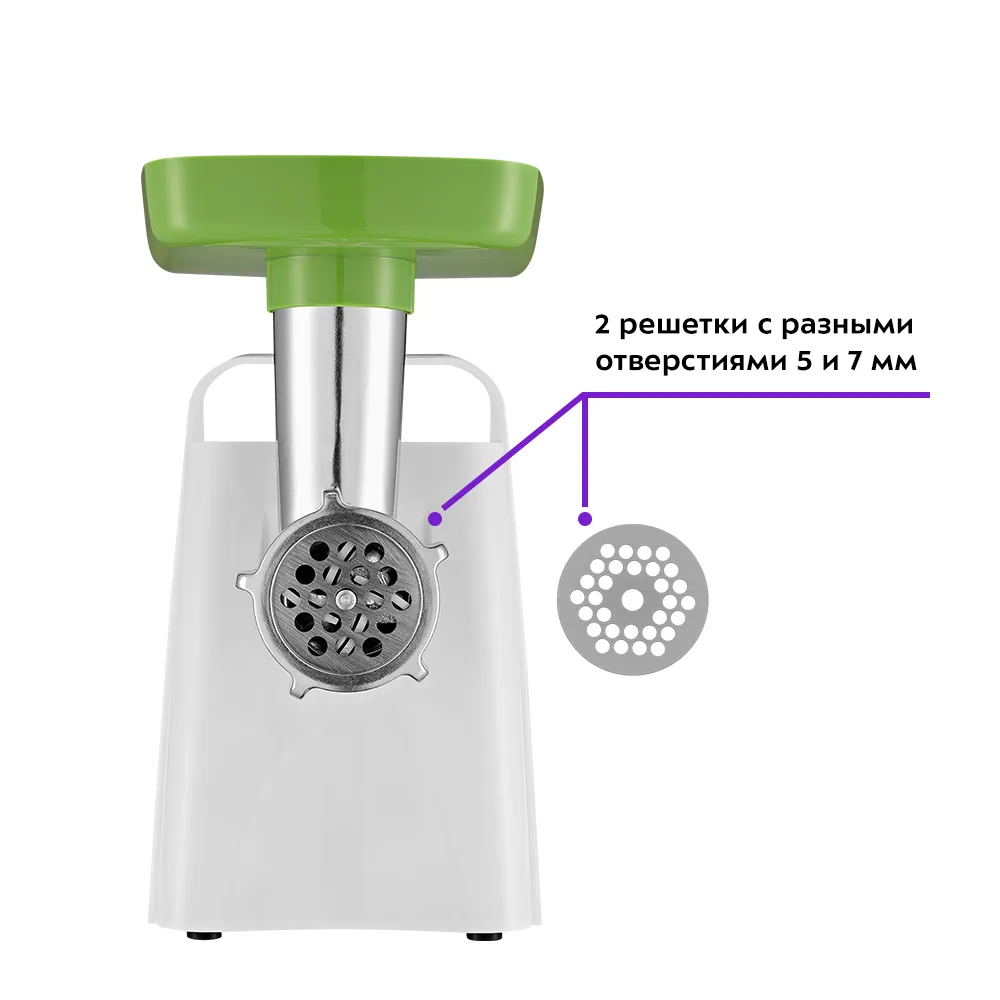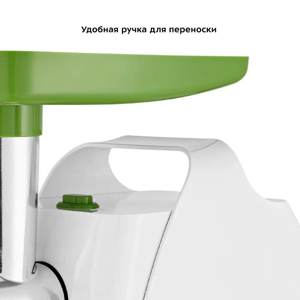 Мясорубка оснащена мощным мотором. Корпус устройства выполнен из пластика. Задние ножки мясорубки с присосками, что повышает устойчивость устройства во время работы. Производительность мясорубки - 1,2 кг фарша в минуту. Одна скорость работы – одна кнопка включения/выключения. Функция «реверс» обеспечит очистку мясорубки без разборки: если на нож намоталась жила, то можно сделать «обратный ход», убрать ненужный элемент мяса и продолжить работу. В комплект мясорубки входят 2 решётки для изготовления фарша 5 и 7 мм для приготовления разного вида фарша, а также толкатель для подачи мяса в горловину. Это удобно для равномерной загрузки мясорубки и тщательного перекручивания мяса. Насадка для колбас поможет сделать их ровными и красивыми, подходящими как для повседневного ужина, так и для праздничного стола. С помощью насадки для кеббе вы с лёгкостью приготовите это популярное блюдо ближневосточной кухни. На верхней части корпуса мясорубки предусмотрена удобная ручка для переноски. Данная модель компактна, удобна в использовании и отличается хорошей производительностью, а ее привлекательный внешний дизайн украсит любую кухню.
