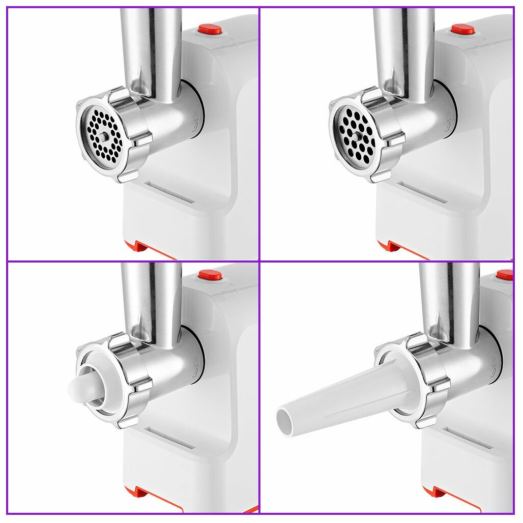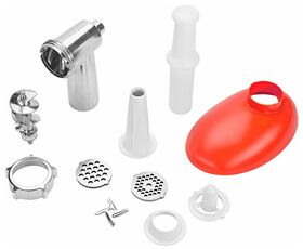 Комплектация 1. Моторный блок — 1 шт. 2. Загрузочный блок — 1 шт. 3. Загрузочный лоток — 1 шт. 4. Толкатель — 1 шт. 5. Шнек — 1 шт. 6. Насадка для кеббе — 1 шт. 7. Крышка насадки для кеббе — 1 шт. 8. Насадка для колбас — 1 шт. 9. Нож — 1 шт. 10. Кольцевая гайка — 1 шт. 11. Решетка с отверстиями 5 мм — 1 шт. 12. Решетка с отверстиями 7 мм — 1 шт. 13. Руководство по эксплуатации — 1 шт. 14. Коллекционный магнит — 1 шт.* *опционально