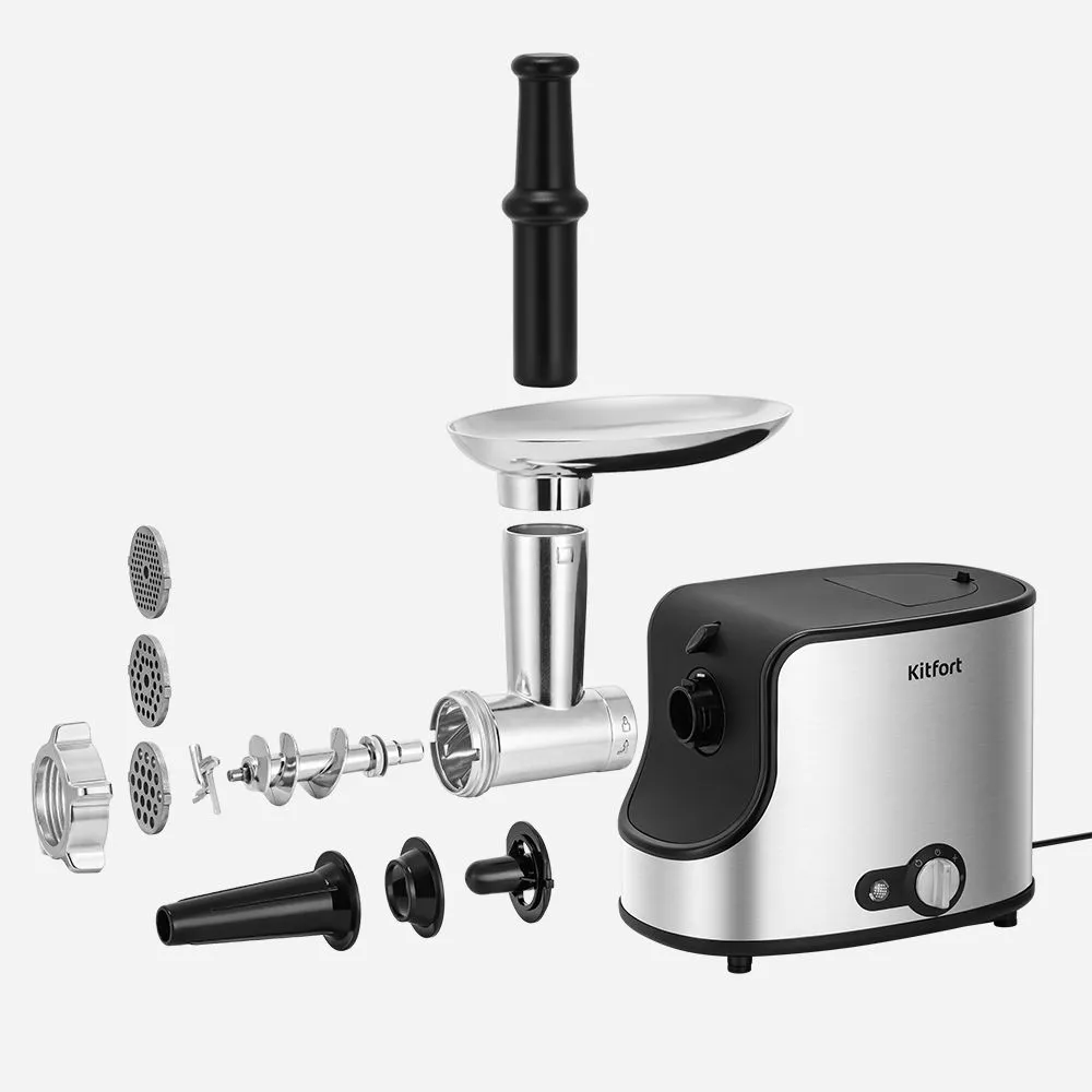 В комплект входят решётки из металла для фарша разного диаметра 3, 5 и 7 мм, которые позволят сделать как котлеты и бифштексы, так и нежнейшие фрикадельки, например, для детского питания.