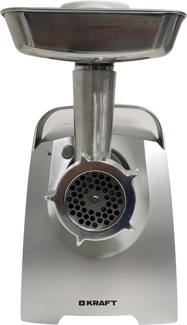 В комплект входят три перфорированных диска разного диаметра, лоток из нержавеющей стали, а также насадки для набивания колбас, насадка для кеббе, толкатель.