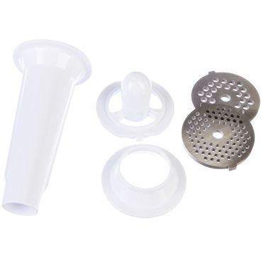 Комплектация металлические режущие диски, нож из нержавеющей стали, насадка для кеббе, колбасок, пластиковый толкатель