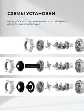 Овощерезка, Диск для крупного помола, Диск для мелкого помола, Диск для среднего помола, Насадка для кеббе, Насадки для колбасок, Нож, Слайсер, Слайсер с рифлением, Терка для крупной соломки, Терка для мелкой соломки, Универсальная терка