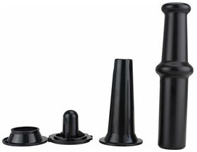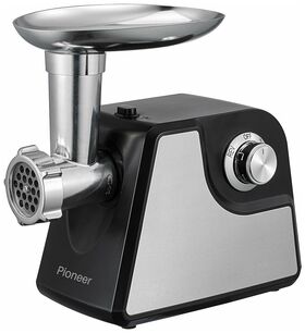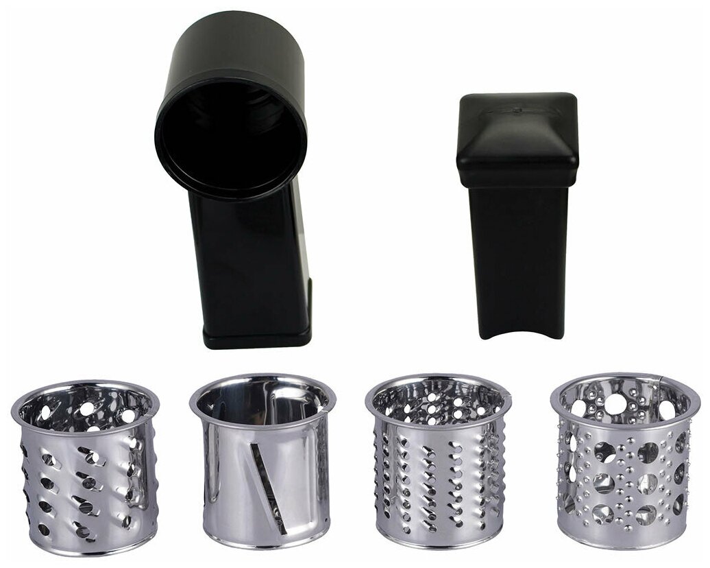 Комплектация толкатель, 3 насадки-терки, насадка для кеббе, насадка для колбас, насадка-шинковка, 3 решетки для фарша