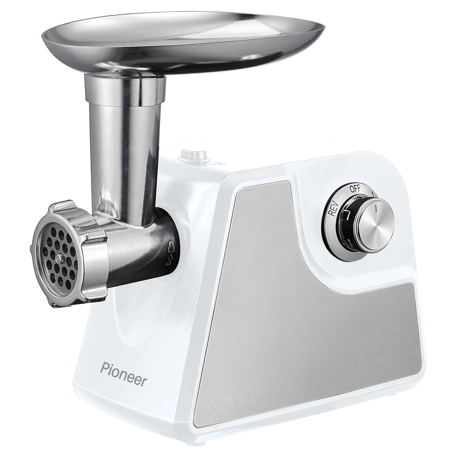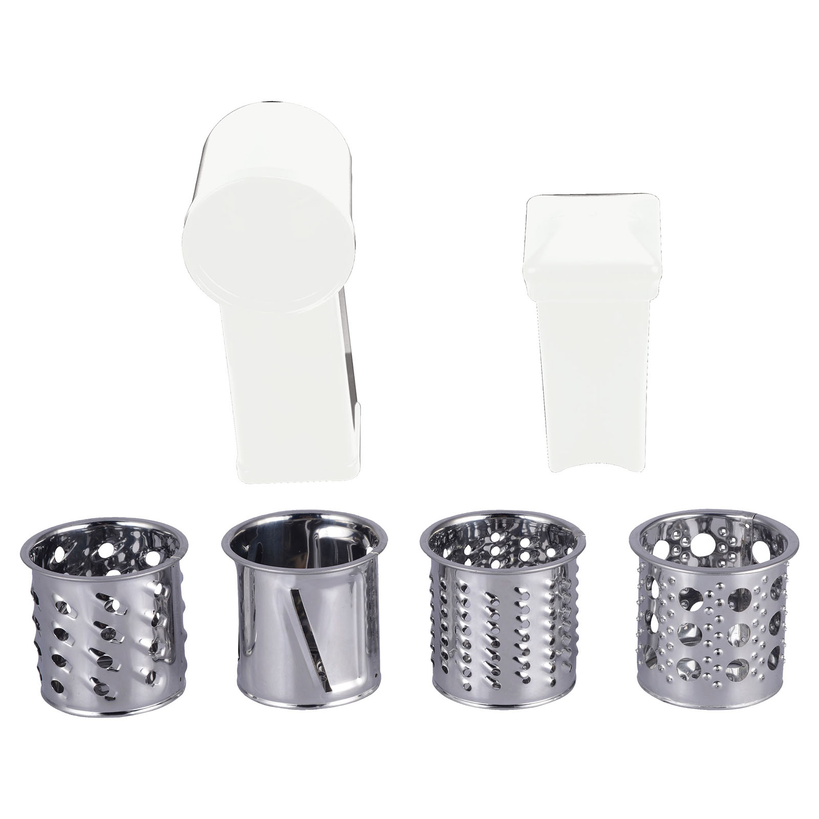 Комплектация толкатель, 3 насадки-терки, насадка для кеббе, насадка для колбас, насадка-шинковка, 3 решетки для фарша