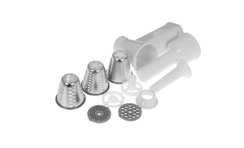 Комплектация толкатель, 3 насадки-терки, насадка для колбас, насадка для кеббе, 3 решетки для фарша