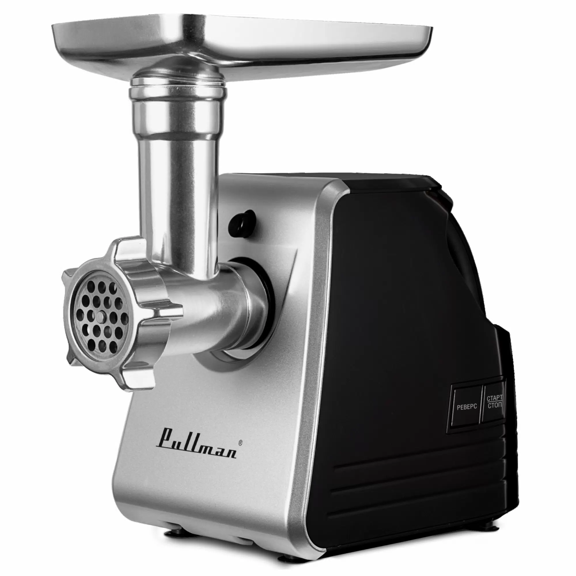 лоток загрузки из металла, реверс, насадка для печенья, шинковка с тремя барабанами, шнековая соковыжималка, 3 диска для фарша: 3 мм, 5 мм, 7 мм диаметры, удобная ручка для переноски, комплект насадок: для «Кеббе», для колбас.