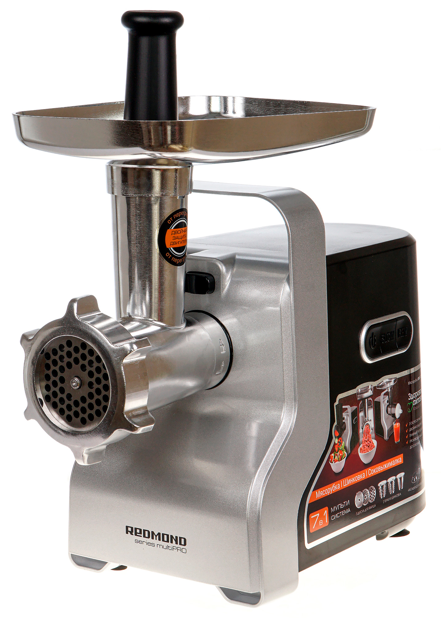 Благодаря широкой комплектации разнообразными насадками электрическая мясорубка Redmond RMG-1230-7 заменит вам сразу несколько кухонных приборов и поможет в приготовлении множества блюд. Устройство производит 2,5 кг фарша в минуту, так что на кухонные хлопоты будут отнимать у вас значительно меньше времени.