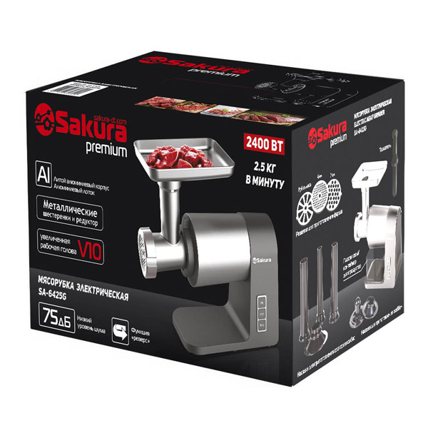Насадки: 3 режущих диска, насадки для приготовления сосисок и колбасок кеббе, пластиковый контейнер