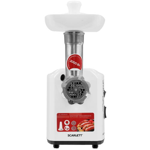 Комплектация 2 перфорированные решетки с отверстиями 5 и 7 мм, насадка для колбас, насадка для кеббе, документация, лоток, толкатель