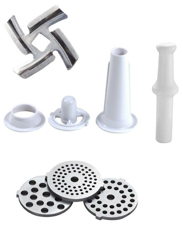 Мясорубка выполненная в белом цвете, оснащена мощным мотором. Мясорубка имеет одну скорость работы и функцию реверса. Производительность прибора 2.2 кг мяса за одну минуту. В комплект входят три решетки для изготовления фарша, а также дополнительные насадки для колбас. Корпус, элементы и лоток мясорубки легко мыть и чистить. Эта модель выглядит солидно, и она, действительно, удобна в использовании, а её облик гармонично дополнит любую кухню.