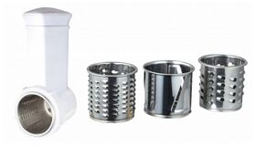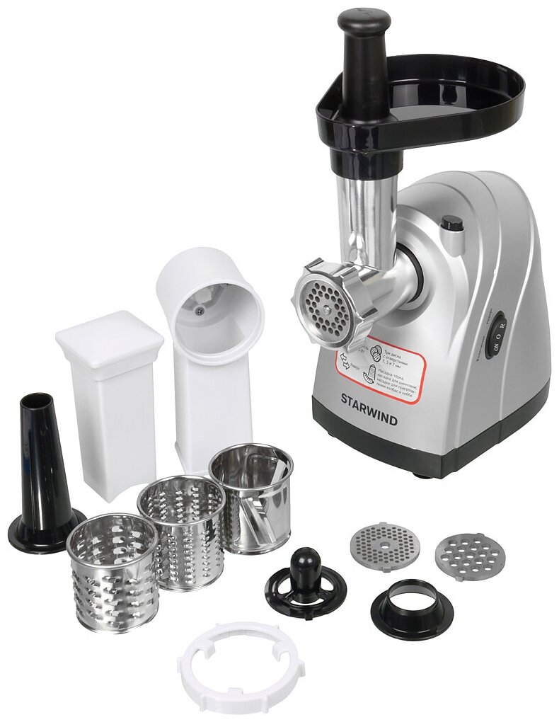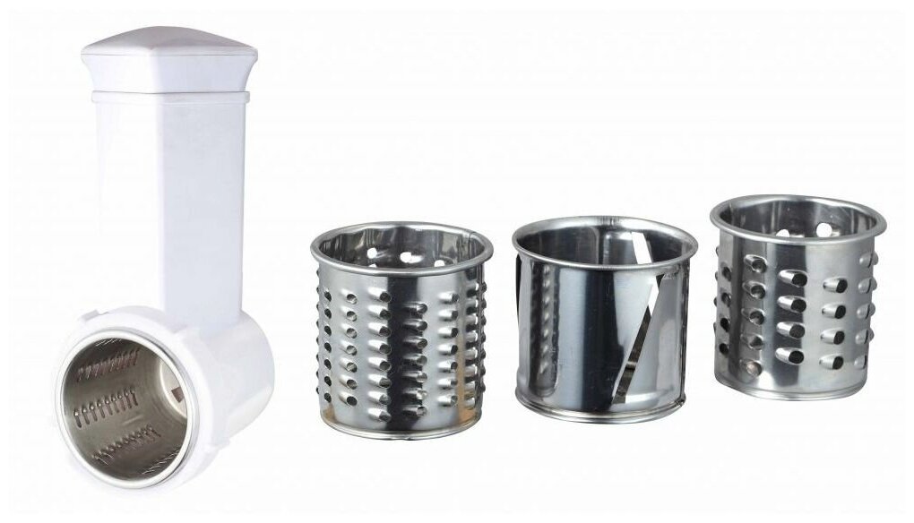 толкатель; материал лотка: пластик; количество насадок-терок: 2; количество насадок для шинковки: 1; не допускается мойка моторного блока, рабочей камеры, шнека, ножа и режущих дисков в посудомоечной машине